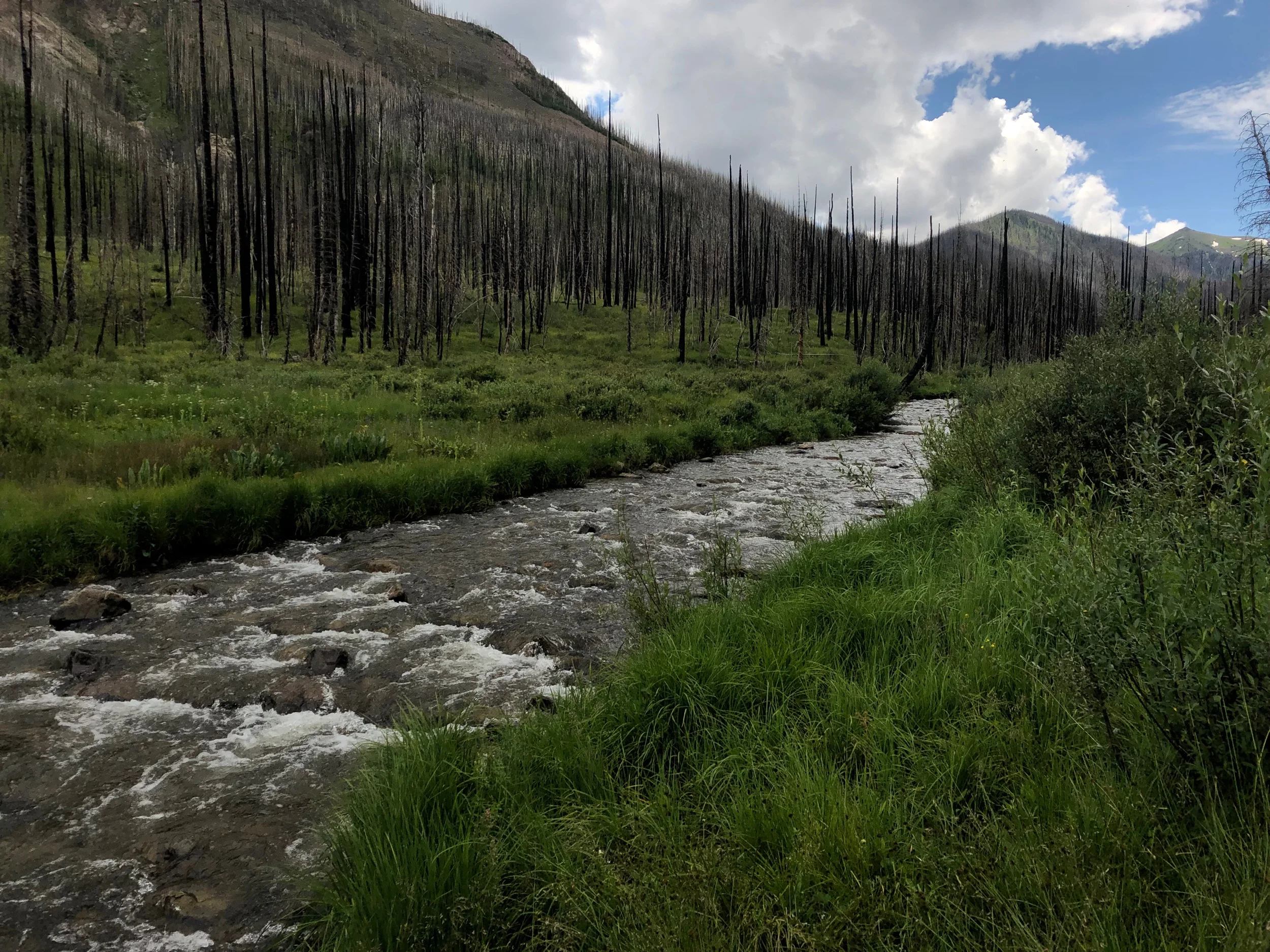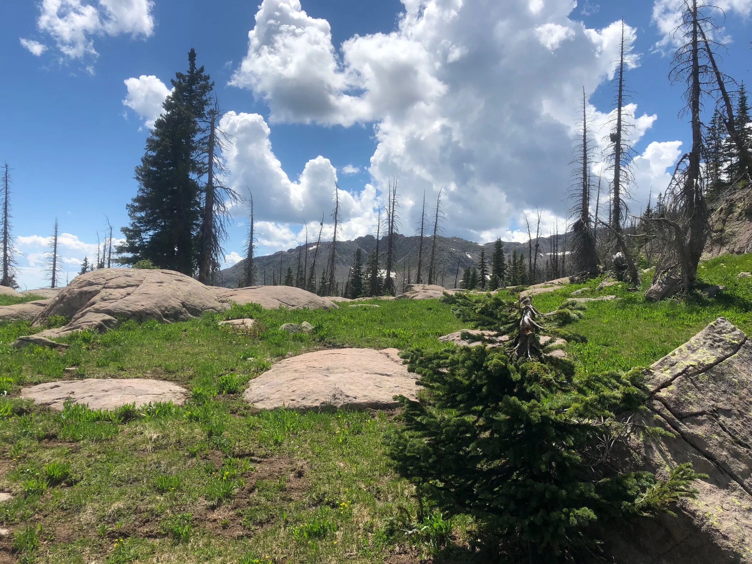 Day 2: I woke up this morning not wanting to get out of my sleeping bag. I finally made an effort to put on my damp socks and pants. The sun just started climbing over the mountain. The warmth of the sun never felt so welcoming. (The good thing is once I get to Creede I’ll have my rain pants so I won’t have to wear wet clothes for long.) I packed up my stuff and began to climb the mountain. Along the way I saw a marmot laying on a rock. About 4 miles in I took the cut off through the valley towards Creede. The first 2.5 miles were rough. Due to a recent forest fire the trail was non existent. I made my way over hundreds of downed trees as I went downhill along the river. What usually takes me an hour to walk took 2 hours. Once I crossed the Goose River the trail became clear again. I tried to find a way to ford the river without getting wet, but after looking up and down the bank there was no rocks I could hop all the way across. I hopped to a rock in the middle of the river, but then had to step in knee deep cold water. I climbed onto the grassy shore on the opposite side and continued on an semi-established trail. I was walking fast to make up for the lost time with the downed trees. As I was walking I spotted a black figure in the wood line. At first I thought “A cow? No.. a bear?” But then I realized it was a moose! She started walking off and right behind her was a young baby moose. As I walked forward I realized the mom was standing in a little pond. They ran down the trail and as I continued on I saw them on a cliffside on the opposite bank of the river moving back into the woods. I was both cautious and amazed. Amazed, because that’s the first time I’ve seen a moose in person let alone so close. Cautious, because I know moose kill more people in North America than any other big animal and can be very aggressive. As the day went on the afternoon thunderstorms rolled in and of course I got soaked. I just figured I’ll dry out one of these days and the sun can’t stay hidden forever. It rained most of the afternoon and when evening came it died off. I made camp on a rocky embankment, since it was the only relatively flat spot around. I did 18.5 miles today and that leaves me with 13 for tomorrow to get to town.